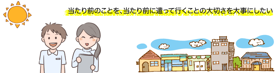 すべてのご利用者さまがご自分の意思により、食事をし、入浴をし、外出をし、友人と会い会話を楽しむなど、そんなあたり前の生活を自分らしく送るあたり前の思いを大切にし、ご利用者さまが望まれる決して特別なことではない、あたり前の介護支援サービスをあたり前の意識にて提供して行きたいと望んでいます。